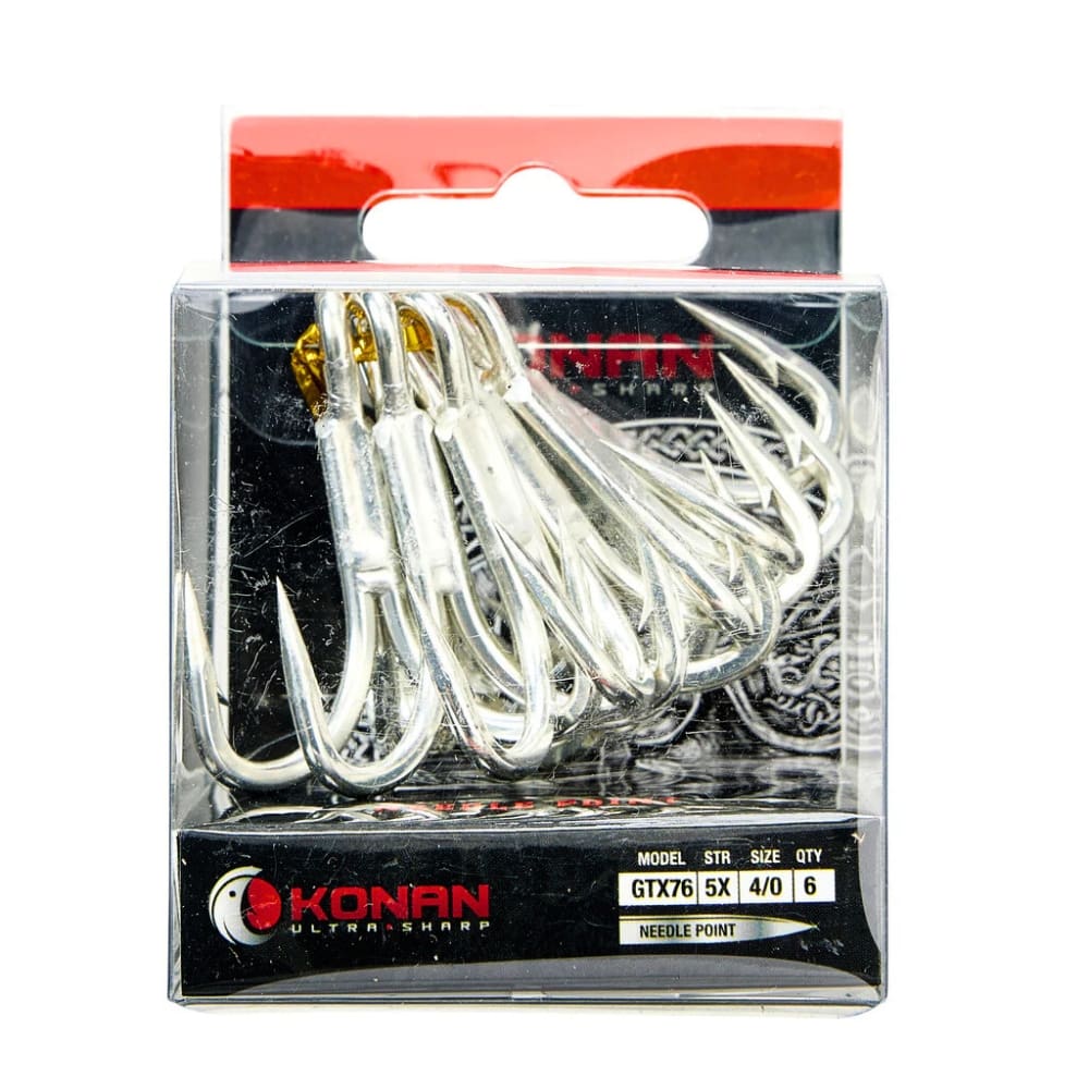 The Konan GTX76 5X Treble Hooks are engineered for serious anglers who demand unmatched strength and instant hook penetration. Designed for use in both freshwater and saltwater environments, these trebles are fitted with a needle point tip that drives deep on contact, ensuring solid hook-ups — even on short strikes.
