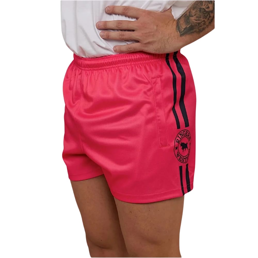 Designed with a high thigh length for maximum movement and a secure elasticated waistband with internal drawcord, they offer both flexibility and a personalised fit. Featuring zipper welt pockets, bold stripe detailing, and the iconic Ringers Western Bull logo, these shorts are made to perform—and made to last.